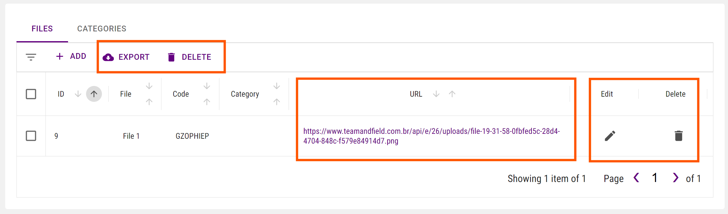 After uploading the file you can check the created URL. You will need it to add in the forms attachments. In this list you can also manage all your files, editing, deleting, and exporting.