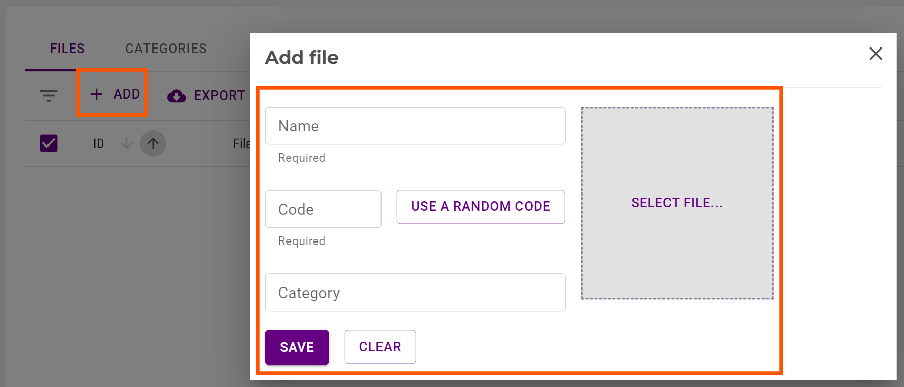 In the tab Files, click on ADD, fill in all the requested information, and SAVE: