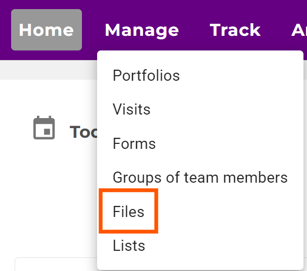 The Files are managed under each Action. First, select the desired Workspace on the left menu, then select the Action you want to work with. Access the MANAGE menu on the top and select Files.