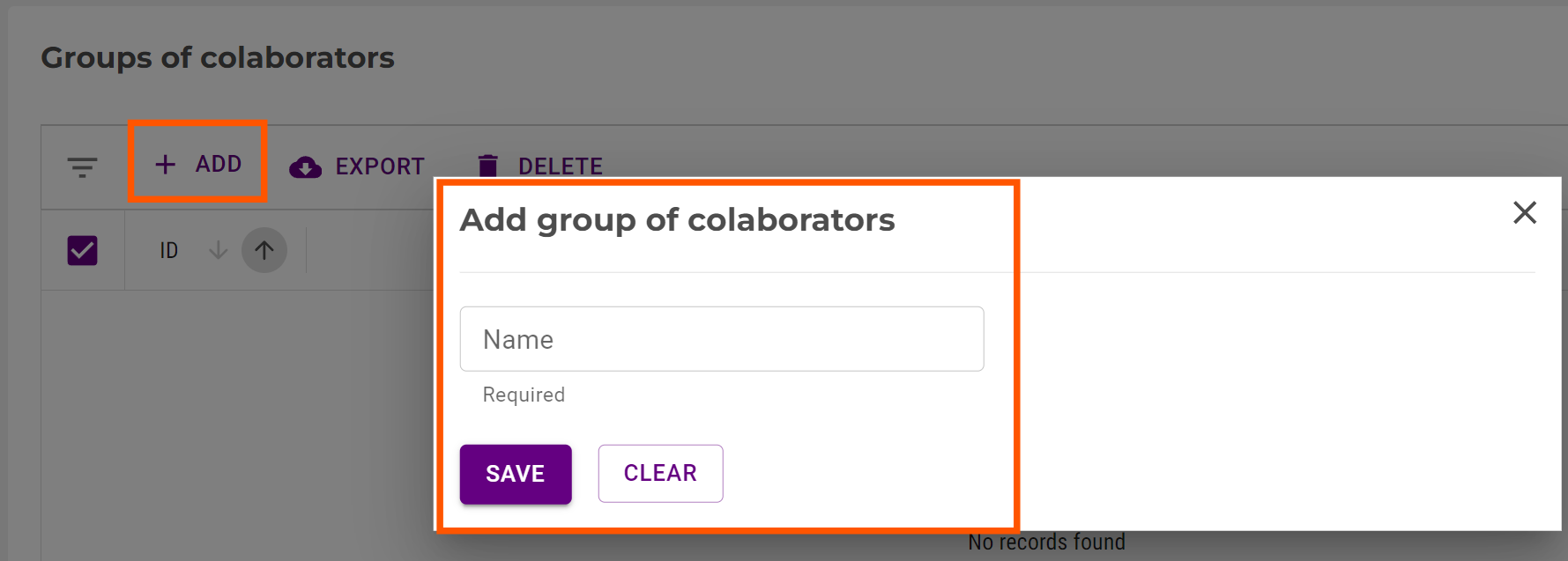 Dentro de la Acción, accede al menú GESTIONE en la parte superior y selecciona Grupos de Colaboradores. Haz clic en "AÑADIR", completa el NOMBRE del grupo y GUÁRDALO.
