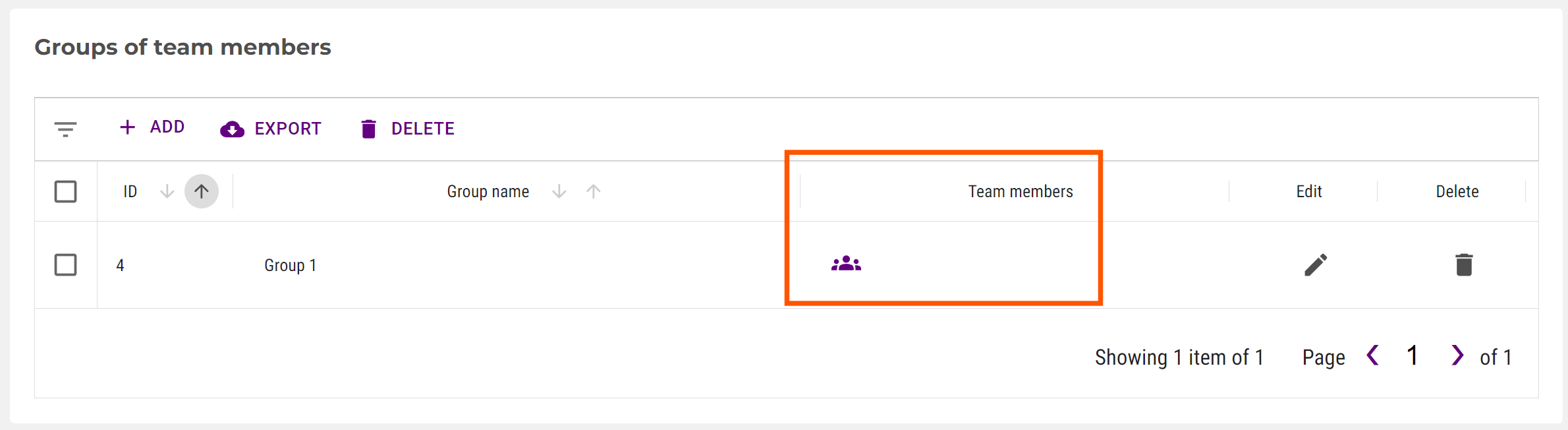 After saving, the new group will appear on the list. Now, add the members for that group. Select the icon option under the column Team Members.