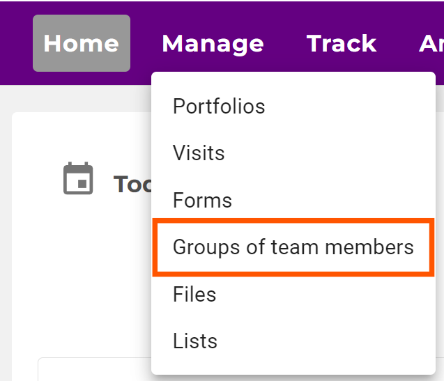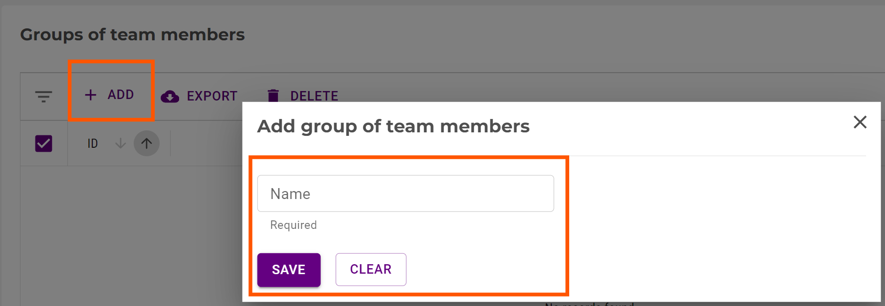 In the Action, access the MANAGE menu on the top and select Groups of team members. Click on ADD, fill in the group NAME, and SAVE.