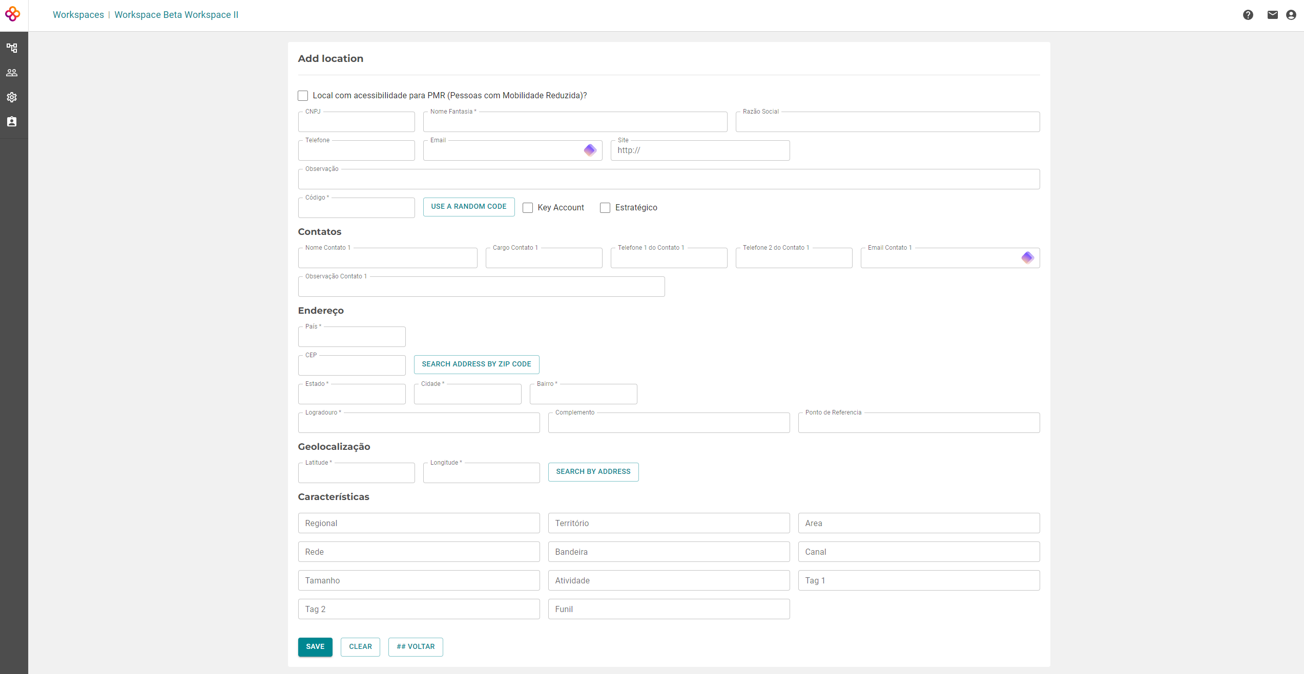 Notice that the fields at the bottom of the form relate to the characteristics of each location. This filling is optional, serving to qualify and segment the registered location according to the criteria of your business if necessary (see below how to register them).