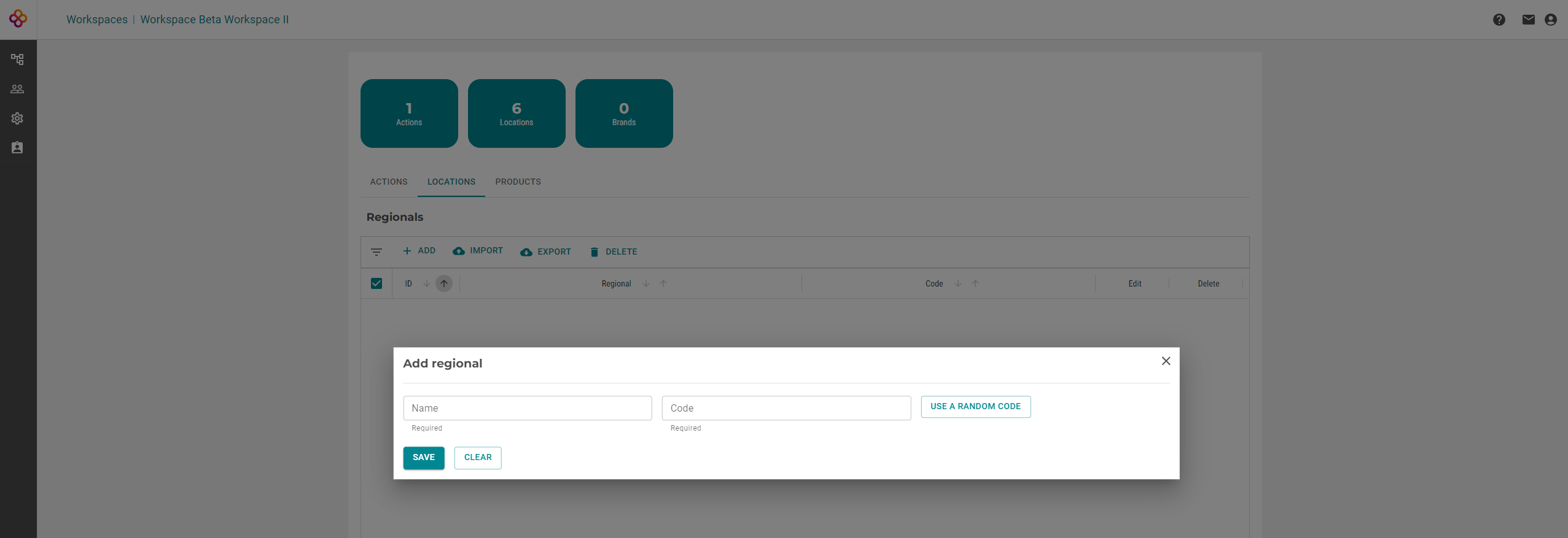 Dependendo da sua organização, você pode definir diferentes características para os segmentos disponíveis. Para adicionar uma opção a esse segmento, basta clicar sobre ele e, na nova janela, clicar em ADICIONAR. Escolha um nome e um código (você pode clicar no botão para usar um código aleatório) e SALVAR. Você pode adicionar quantas opções desejar. Por exemplo, em Regionais, você pode adicionar os diferentes estados do país onde você tem locais.